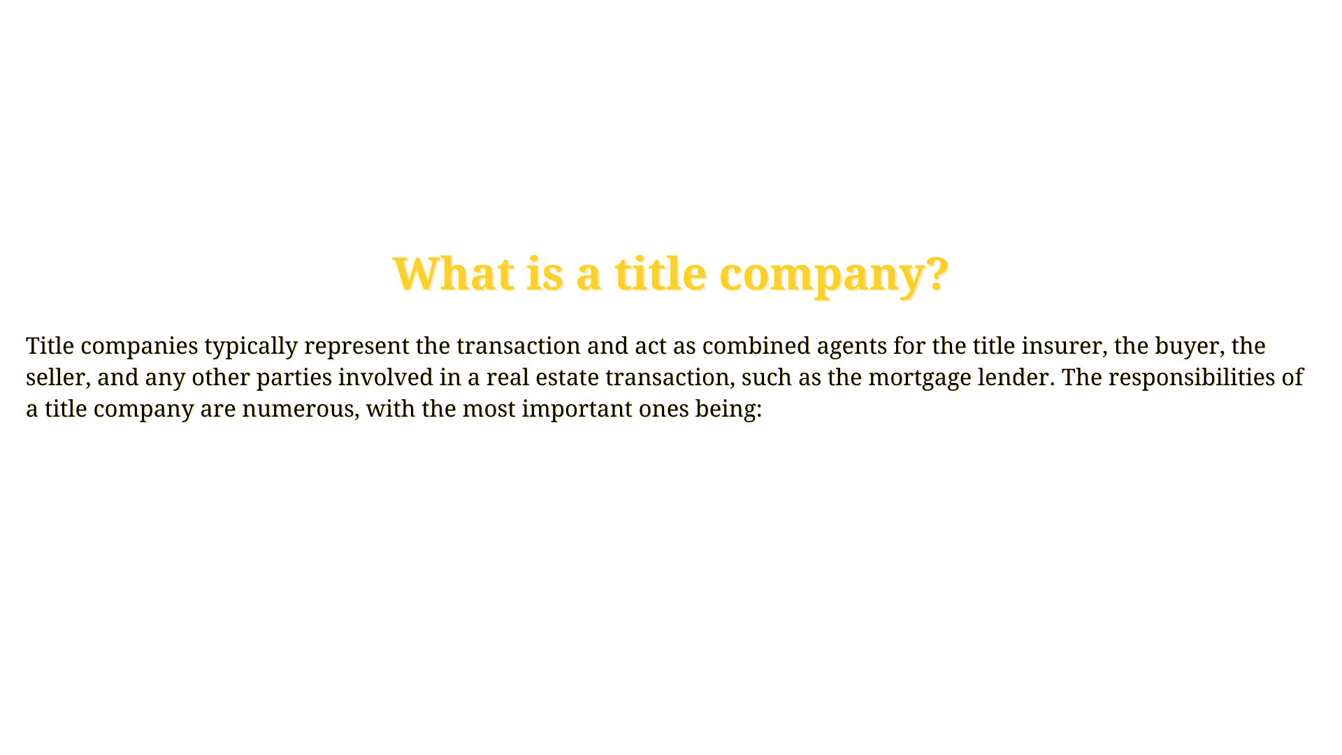 • Property title analysis for issuing a title insurance commitment. With this step, a history of ownership is investigated, and during this research, situations that require resolution before the purchase can be discovered. If there's no solution, a decision is made whether to issue the title insurance.